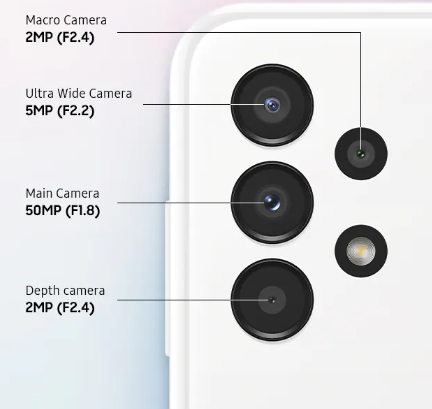 - Camera: 50 MP, f/1.8, (wide), PDAF | 5 MP, f/2.2, 123˚ (ultrawide), 1/5″, 1.12µm | 2 MP, f/2.4, (macro) | 2 MP, f/2.4, (depth) | 8 MP, f/2.2, (wide)
